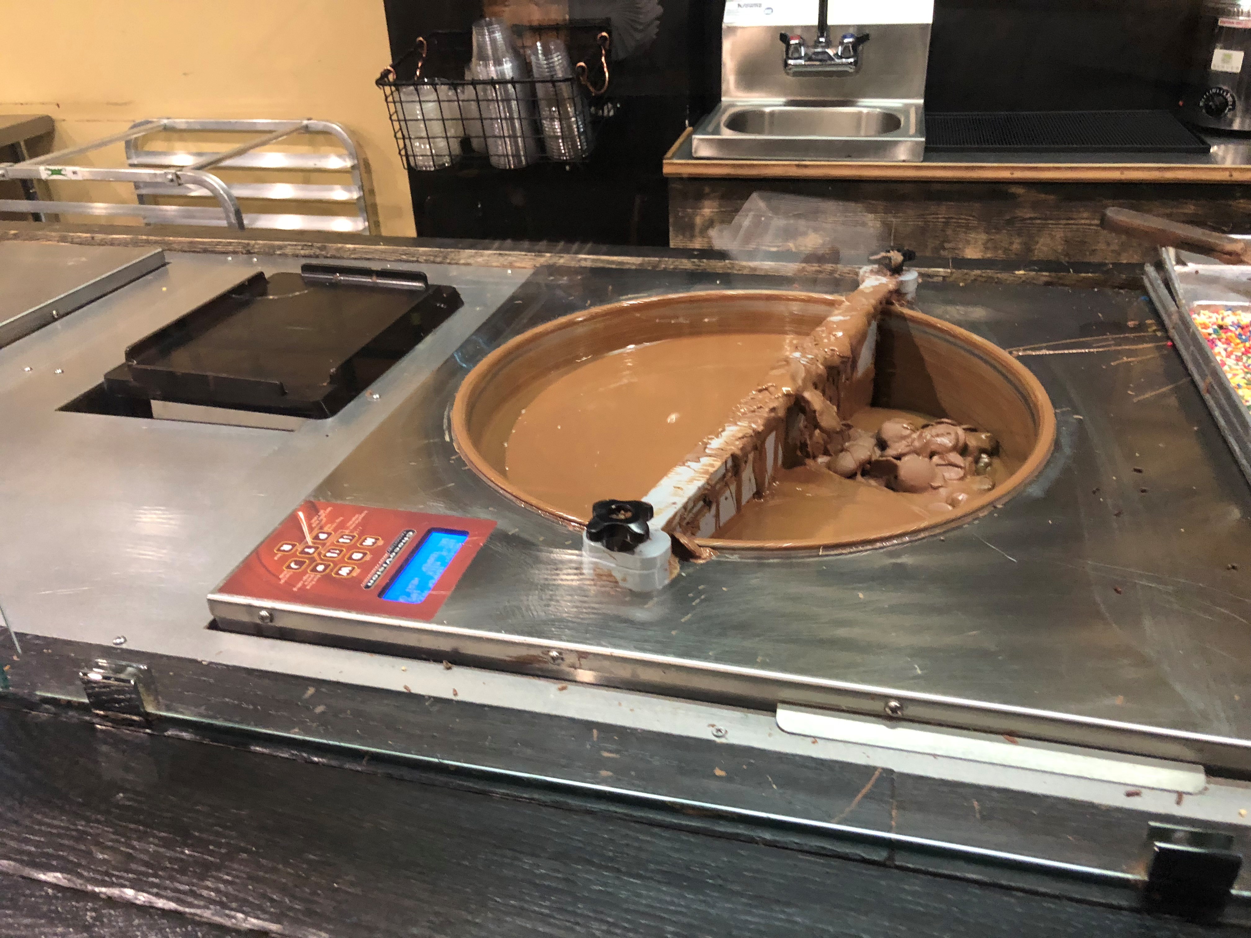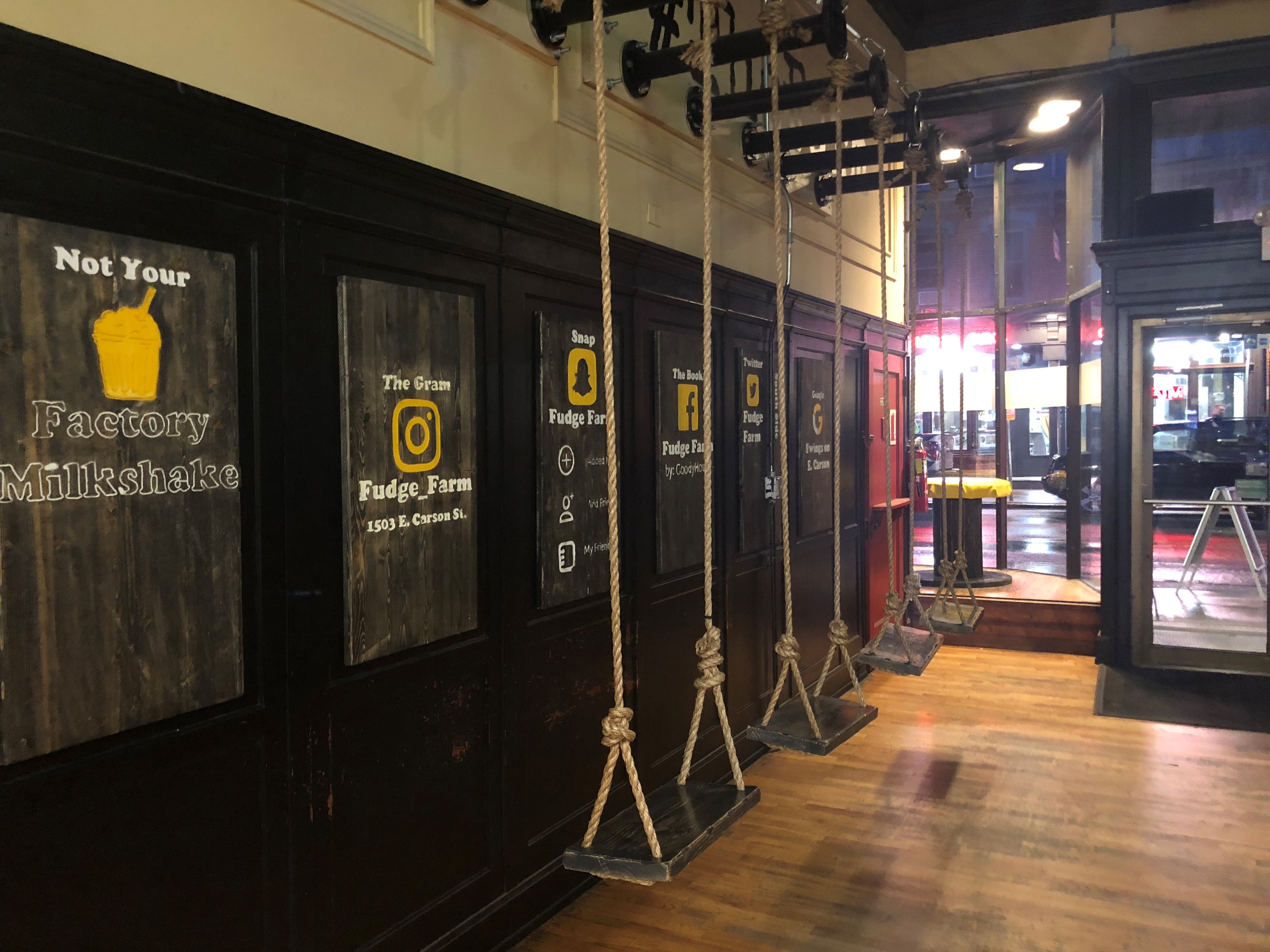 The dessert shop has an inviting feel that makes you want to stick around while drinking an incredible milkshake. The walls and tables look like they are made from wood which helps to add the farm aspect of Fudge Farm. Another cool thing about Fudge Farm is that they have swings! So, while you’re sipping on a milkshake, you can swing while reminiscing your childhood.