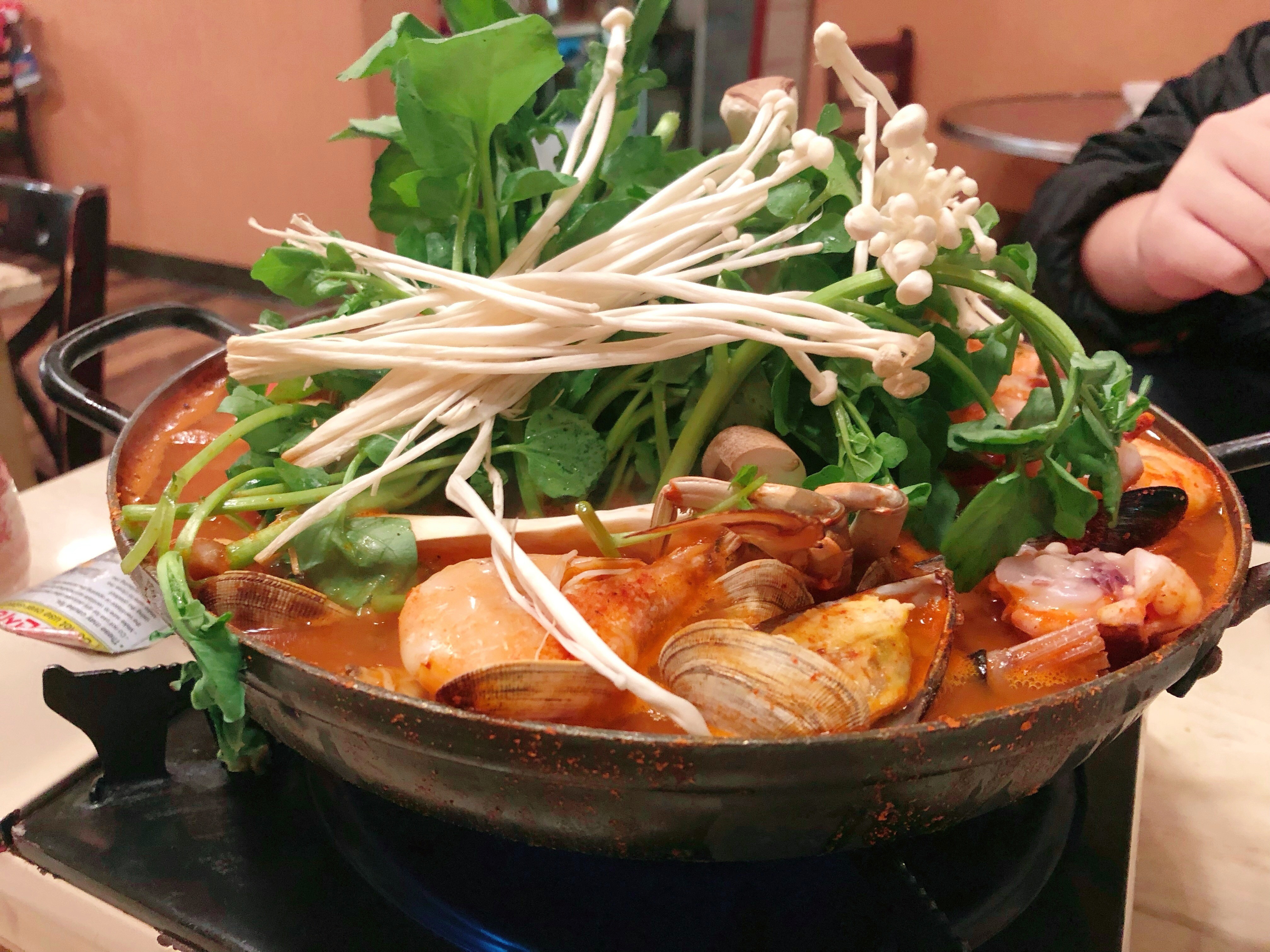 Haemul Jungol is a Korean hot pot, with monkish, clams, mussels, squid, octopus, shrimp, blue crab, udon noodles, tofu, spicy seafood broth, served with two bowls of rice. Haemul Jungol is my favorite, and I recommend everyone go and give it a try. Here I have some tips to share. Udon noodles are enough for two people, I think people who don’t eat much have no need to ask for rice. Also, I wonder if cook in Nak Won Garden is changed; it does not as tasty as usual. For monkish in the hot pot, they are parts near branchia and fin. From the photos in the below, it seems a lot, but it’s wrong. The bottom is udon noodles. The ingredients are too few for a $45.99 dish.