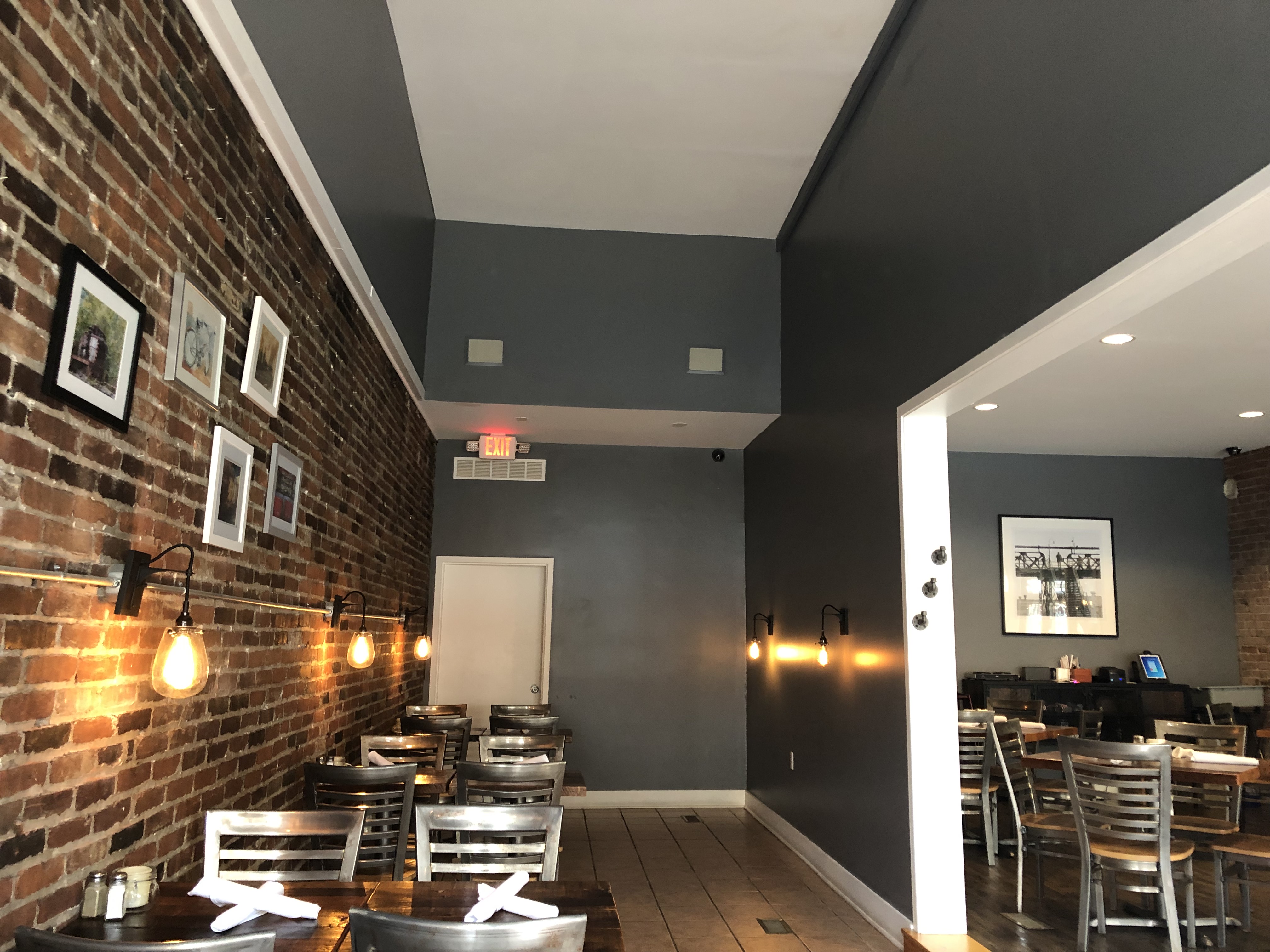 The wall is dark blue, more like powder blue under warm lights. The inner decoration is close to rustic-industrial style, with iron chairs and iron-grey wooden tables. Warm lights are widely applied on the wall, and it balances the calm air. There is a bar table in the lobby, with two television in front of chairs. An early map of Homestead is hung on the wall, a sketch version of the aerial view of Homestead in 1902: