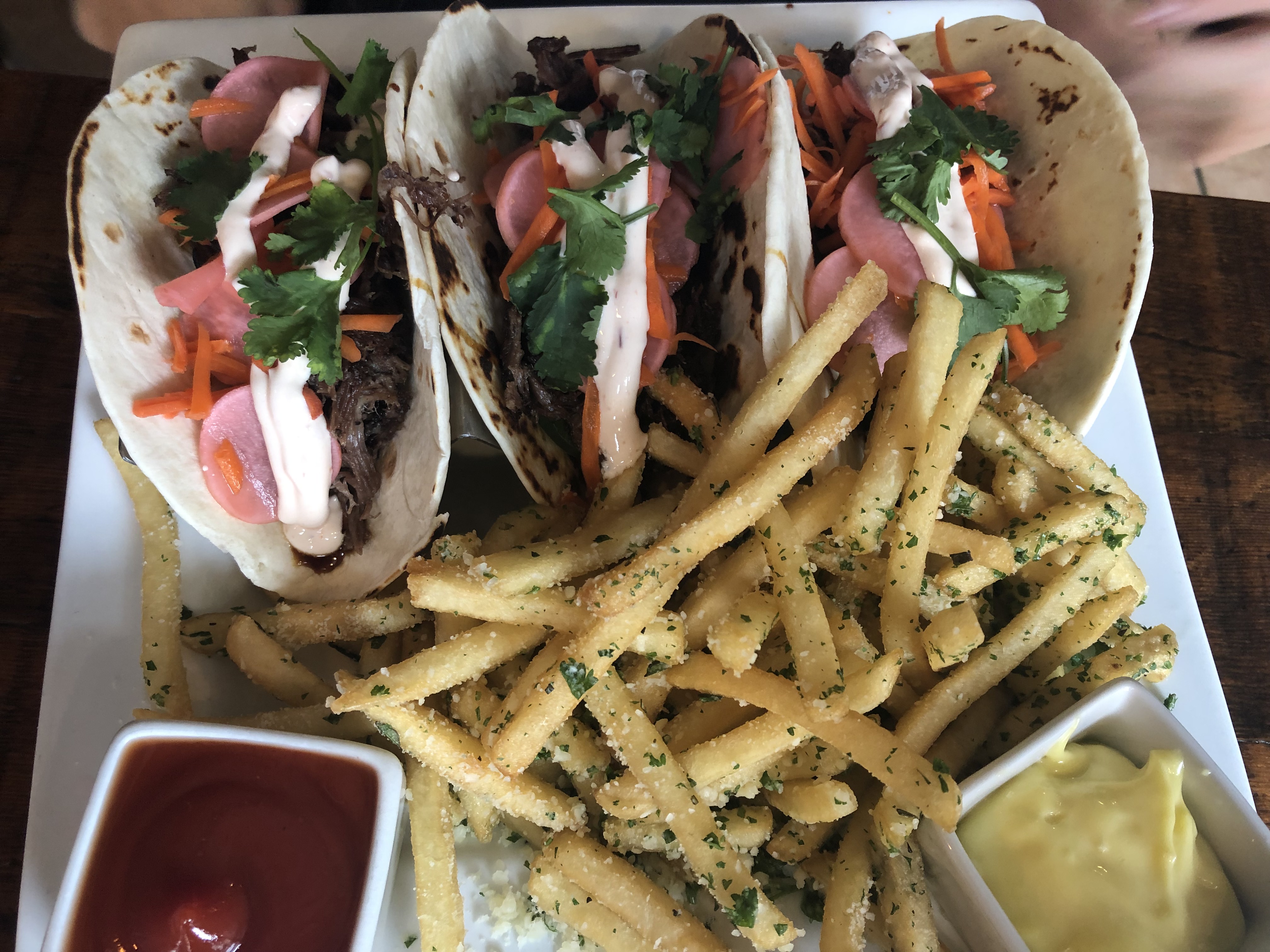 My friend ordered tacos with fries, and I ordered shrimp and grits. I give five stars to fries: it’s freshly made, with cheese and parsley on the top. The surface crispy, and the inner is soft and creamy. Highly recommend. Tacos, in my friend’s word, “is not as good as the one on campus.” I never try tacos on campus (near Sichuan gourmet), so I can’t tell if it’s true or not. Meat is a bit dry. Hard to say I like shrimp and grits: it didn’t fit my taste. These two dishes are in Big Eats, and we only eat half of them. For people who are not starving, I suggest you order something else.