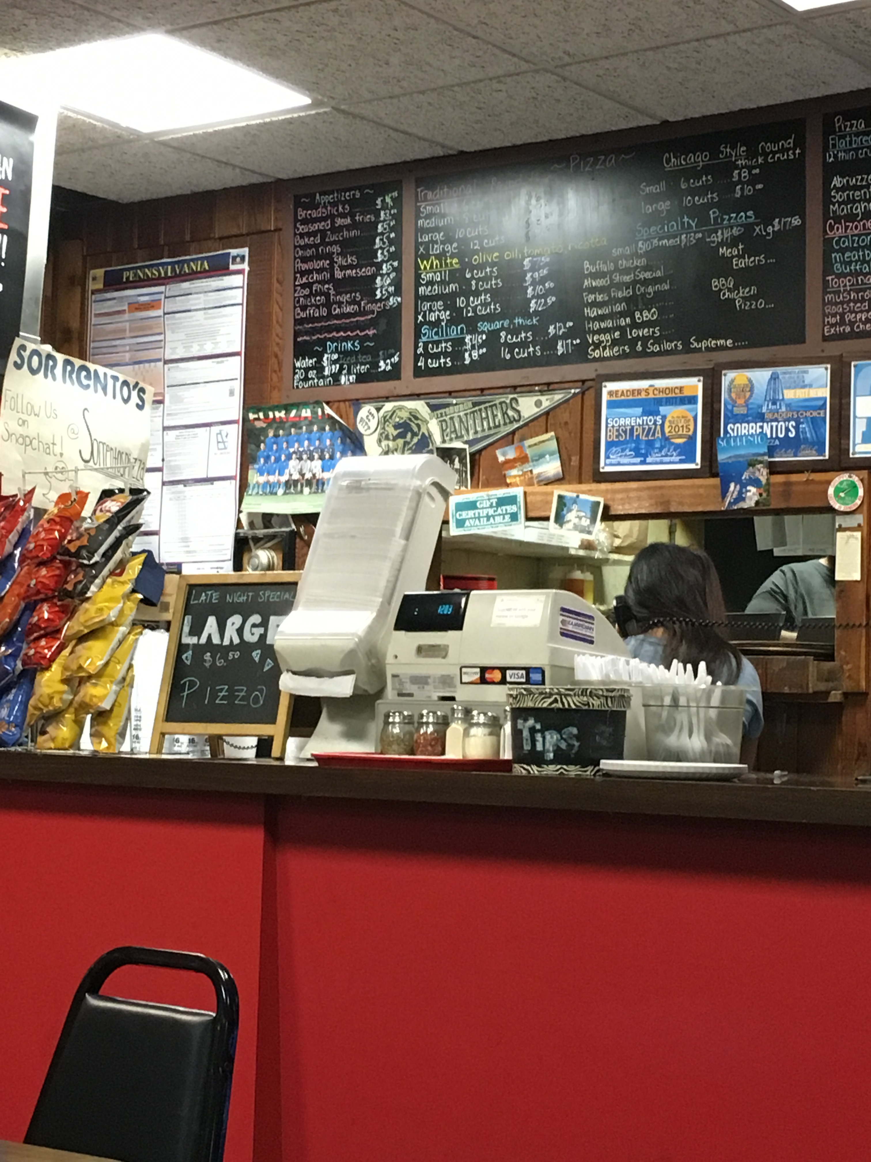 The wood paneled interior of the shop gives Sorrento’s a run down 1970’s vibe that fits its reputation as a late-night college student mecca where half the customers probably do not know what day it is. The chalkboard menu in front of the kitchen fits perfectly with the overall ambiance. There is no glamour, but there is affordable good pizza. This is the most important thing any student should be looking for.Getting pizza at Sorrento’s Pizza Roma is a tradition that is part of the Pitt experience. Hopefully the student body can move past the Sorrento’s-Antoon’s rivalry and appreciate what both represent: greasy cheap pizza available long into the Oakland night.